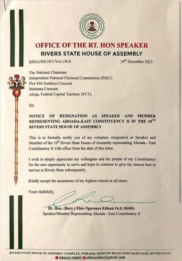 “This is to formally notify you of my voluntary resignation as Speaker and Member of the 10th Rivers State House of Assembly representing Ahoada – East Constituency II with effect from the date of this letter.
