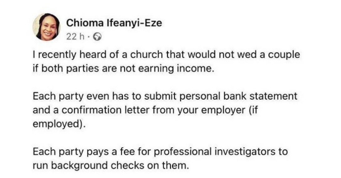 Taking to her Facebook page, Ifeanyi-Eze, noted that the church maintained that couples who wish to get married will provide personal bank statement and a confirmation letter from their employers (if employed).