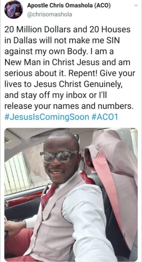 “20 Million Dollars and 20 Houses in Dallas will not make me SIN against my own Body. I am a New Man in Christ Jesus and am serious about it. Repent! Give your lives to Jesus Christ Genuinely, and stay off my inbox or I’ll release your names and numbers. #JesusIsComingSoon #ACO1”